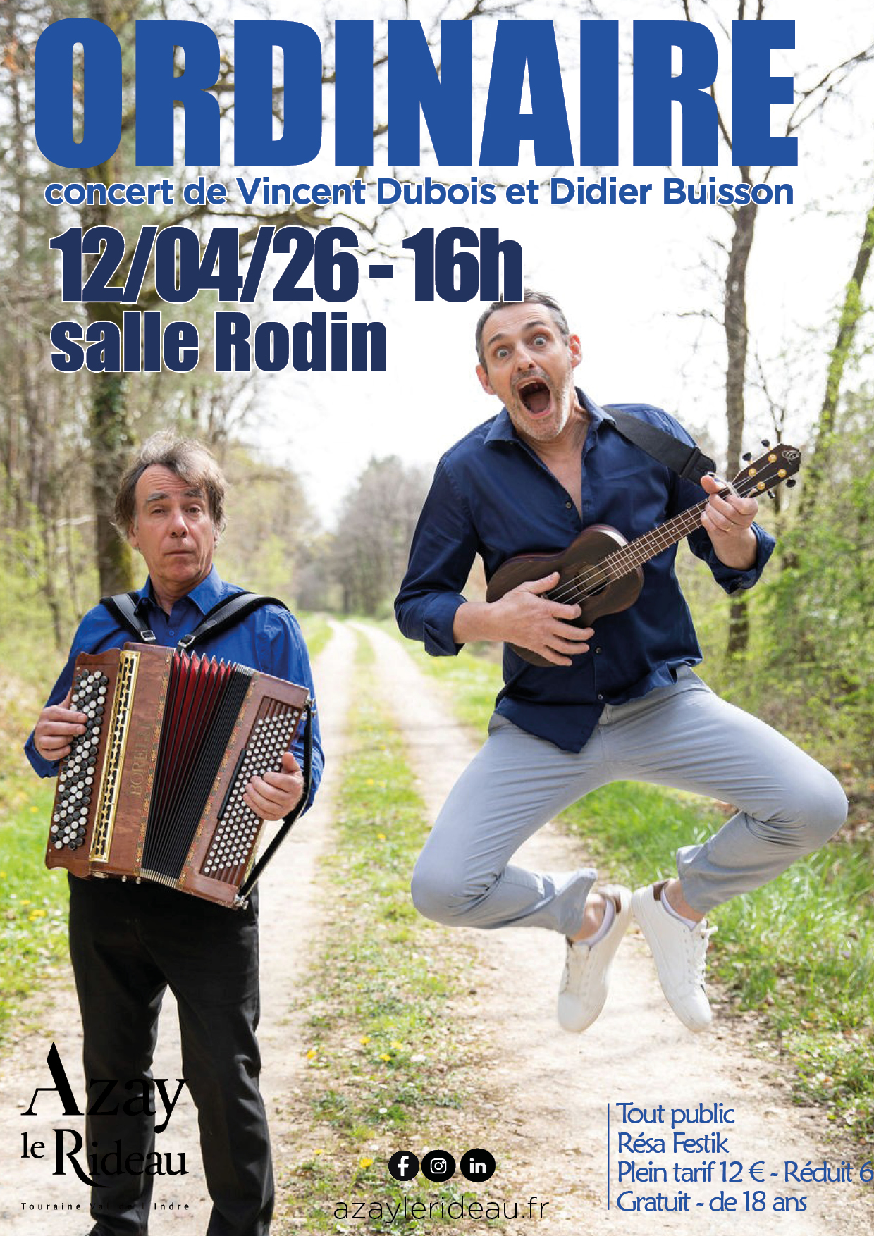 La ville d’Azay-le-Rideau est très fière d’accueillir Vincent Dubois et Didier Buisson pour leur spectacle Ordinaire. En marge des célèbres Bodin’s, Vincent tombe le masque de la Maria, pour nous faire découvrir ses talents de chanteur ! Dans un répertoire choisi de chansons françaises et canadiennes, il passe du rire aux larmes et de l’émotion à la déconne ! Tantôt à la guitare, tantôt au ukulélé et surtout accompagné avec brio par Didier Buisson, accordéoniste sensible et virtuose !