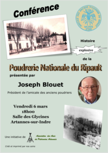 Conférence « l’Histoire Explosive de la Poudrerie Nationale du Ripault » présentée par Joseph Blouet, président de l’amicale des anciens poudriers du Ripault. Le vendredi 6 mars à 18h dans les salles des Glycines (1er étage – au-dessus de la médiathèque) d’Artannes-sur-Indre.