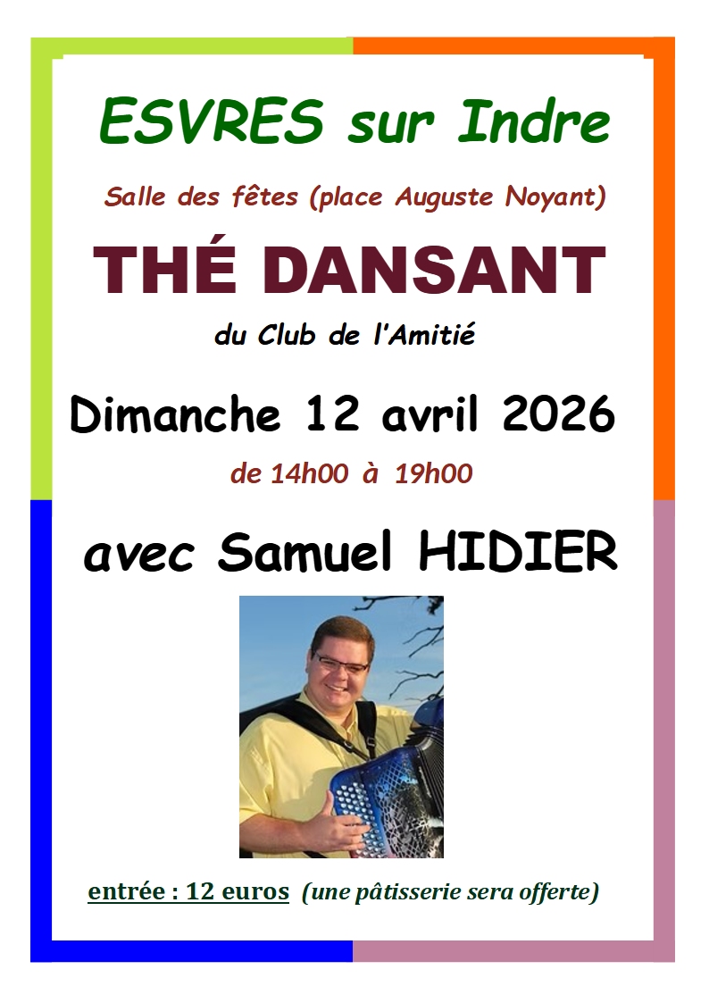 Le dimanche 12 avril 2026 salle des fêtes, place Auguste Noyant, à ESVRES SUR INDRE de 14H00 à 19H00 avec l’orchestre SAMUEL HIDIER.
