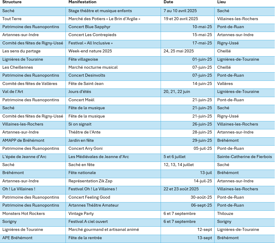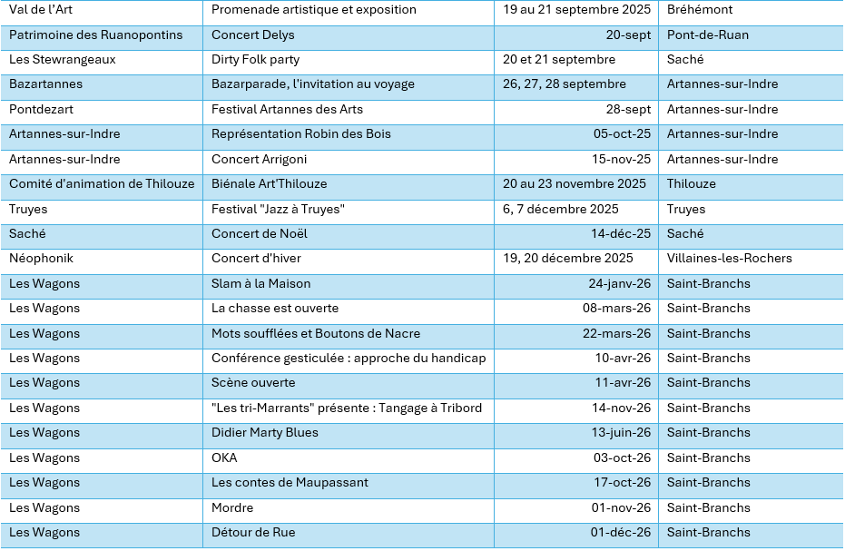 Les évènements culturels en Touraine Vallée de l’Indre (soutien CCTVI)
